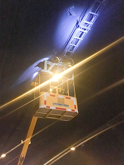 中午11:00,因流量過大,高速交警要求臨時開放被堵主車道。趁此空隙機會,中心隊伍暫撤到黃土嶺隧道管理所解決午餐,之后又馬不停蹄奔赴并集結(jié)在北洞口緊急停車帶,待重新封道后繼續(xù)跟進(jìn)作業(yè),力爭在審批時間內(nèi)做更多的維修。考慮到主車道燈具損壞不多,抽調(diào)一組登高車人員負(fù)責(zé)攝像頭檢修工作,而底下人員則負(fù)責(zé)修復(fù)更換消防、緊急電話等標(biāo)志燈,每組人員都在與時間賽跑,忙的顧不上喝水。