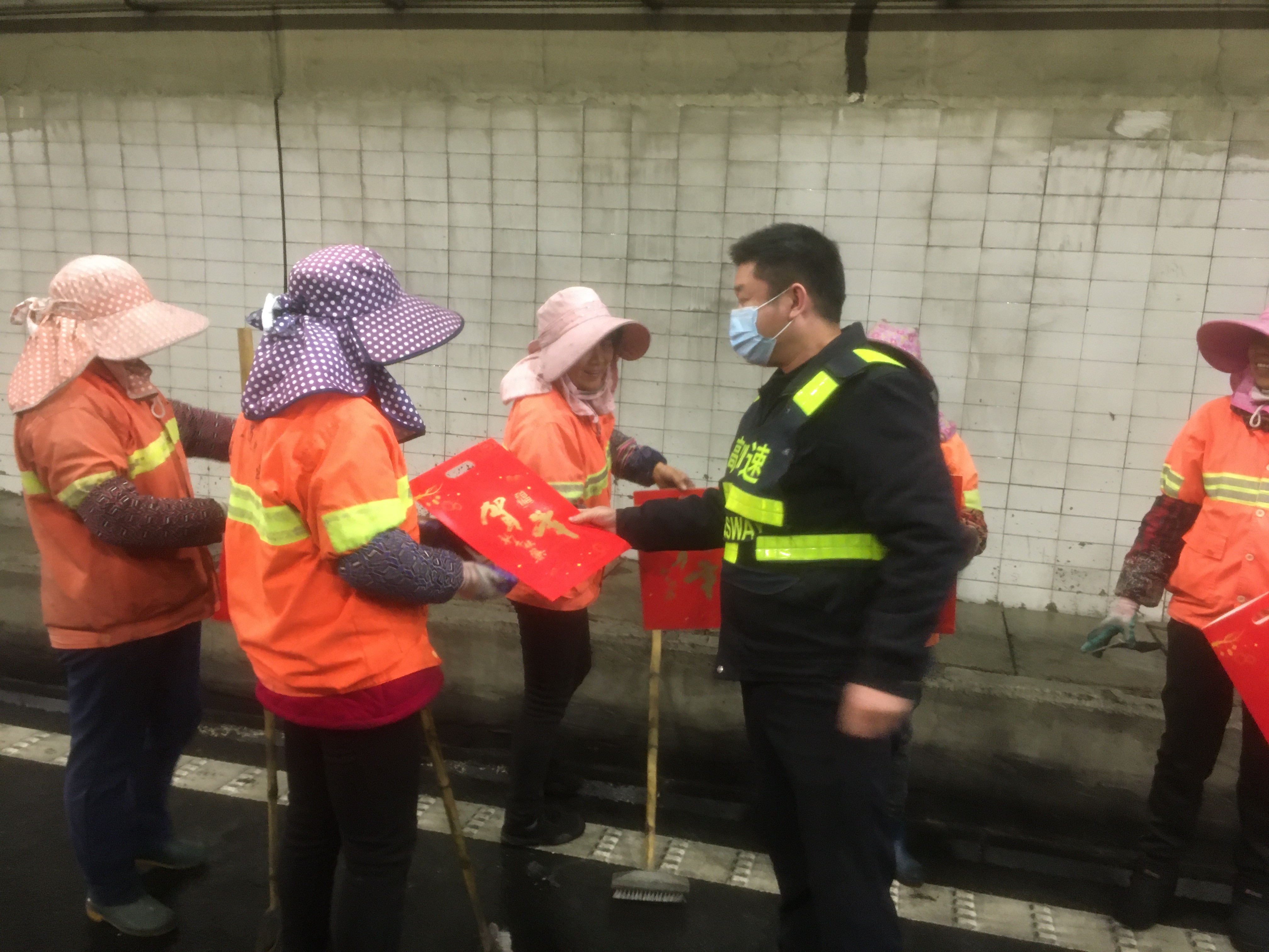 上午十點左右,盧所把工人們迎到食堂,熱情的招呼著大家。當班的隊員們把一碗碗熱乎乎的臘八粥送到養護工人們的手中,吃著這冬日里的熱粥他們臉上露出了由衷的笑容。 下午,從公司匆匆趕回來的應所帶領隊員們對隧道的清洗情況進行了驗收,肯定了養護工人們的勞動成果,并表示了親切的慰問,同時把一幅幅春聯親自送到了他們的手中。