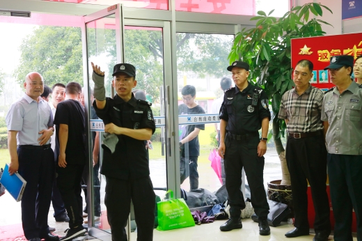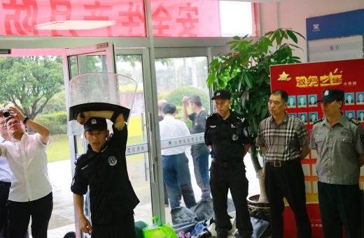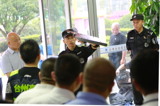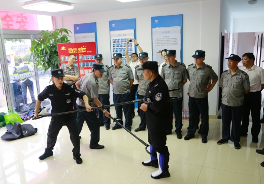 圖為物業人員現場練習器械使用 演練開始前,盧尚明對防爆盾牌、防爆鋼叉、抓捕器、警棍等各類防爆器材的功能和使用方法進行一一講解,并示范操作,以及帶領大樓浙師大印象物業人員現場練習器械使用。
