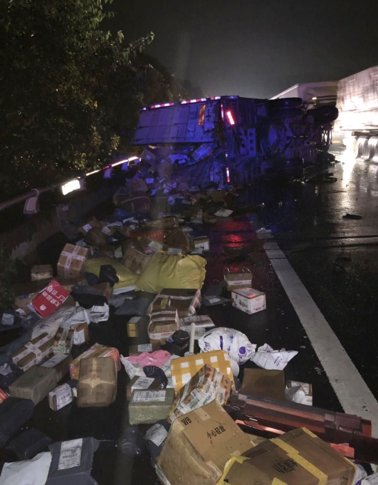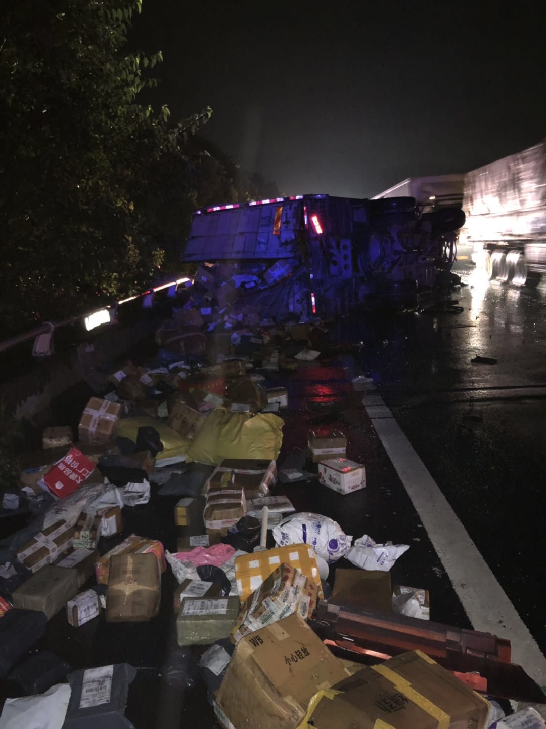 7月14日凌晨1點,溫州方向臺州南收費所附近,一輛半掛型大貨車和一輛快遞車相撞,半掛車直接沖出高速,四腳朝天??爝f車則是被巨大的沖擊力撞向了硬路肩,側翻中撒下數十米的貨物。1點10分,救援車輛到達現場,現場一片狼藉,防撞護欄板、護欄柱損傷嚴重,橋梁鋼管都折斷了不少。