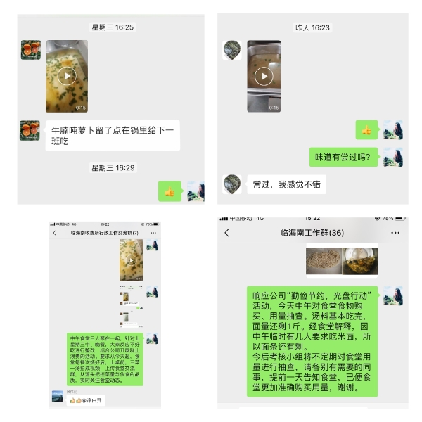 臨海南收費(fèi)所不只是單單把宣傳標(biāo)語(yǔ)掛在墻上,擺在桌上。更把節(jié)約舉措落實(shí)到具體行動(dòng)中。為了不浪費(fèi)食材,行政人員提前安排一周菜單,并統(tǒng)計(jì)用餐人數(shù),規(guī)劃食材數(shù)量,食堂工作人員按照人數(shù)采購(gòu)當(dāng)天食材控制成本,并將每餐燒好的菜拍成視頻上傳食堂交流群,以更好地關(guān)注食堂動(dòng)態(tài),從源頭把控菜量與伙食的品質(zhì),每周還不定期抽查食堂,查看剩余量。