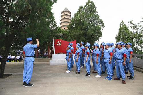 圖為黨員在梁家河合影 不顧前一天的舟車勞頓,第二天一大早,黨員們整裝出發,在紅色旗幟引領下,頂著烈日,一路步行到達寶塔山山頂。“手抓黃土我不放,緊緊兒貼在心窩上。幾回回夢里回延安,雙手摟定寶塔山。”綜合支部的小周對著寶塔山,情不自禁地大聲誦讀起賀敬之的《回延安》。黨員們在巍巍寶塔下高舉右拳,用鏗鏘有力的聲音宣讀了入黨誓詞,對于大家來說,重溫入黨誓詞是共產黨員表達自己為共產主義奮斗終生的最佳方式,黨員們的心靈再次受到震撼和洗禮。